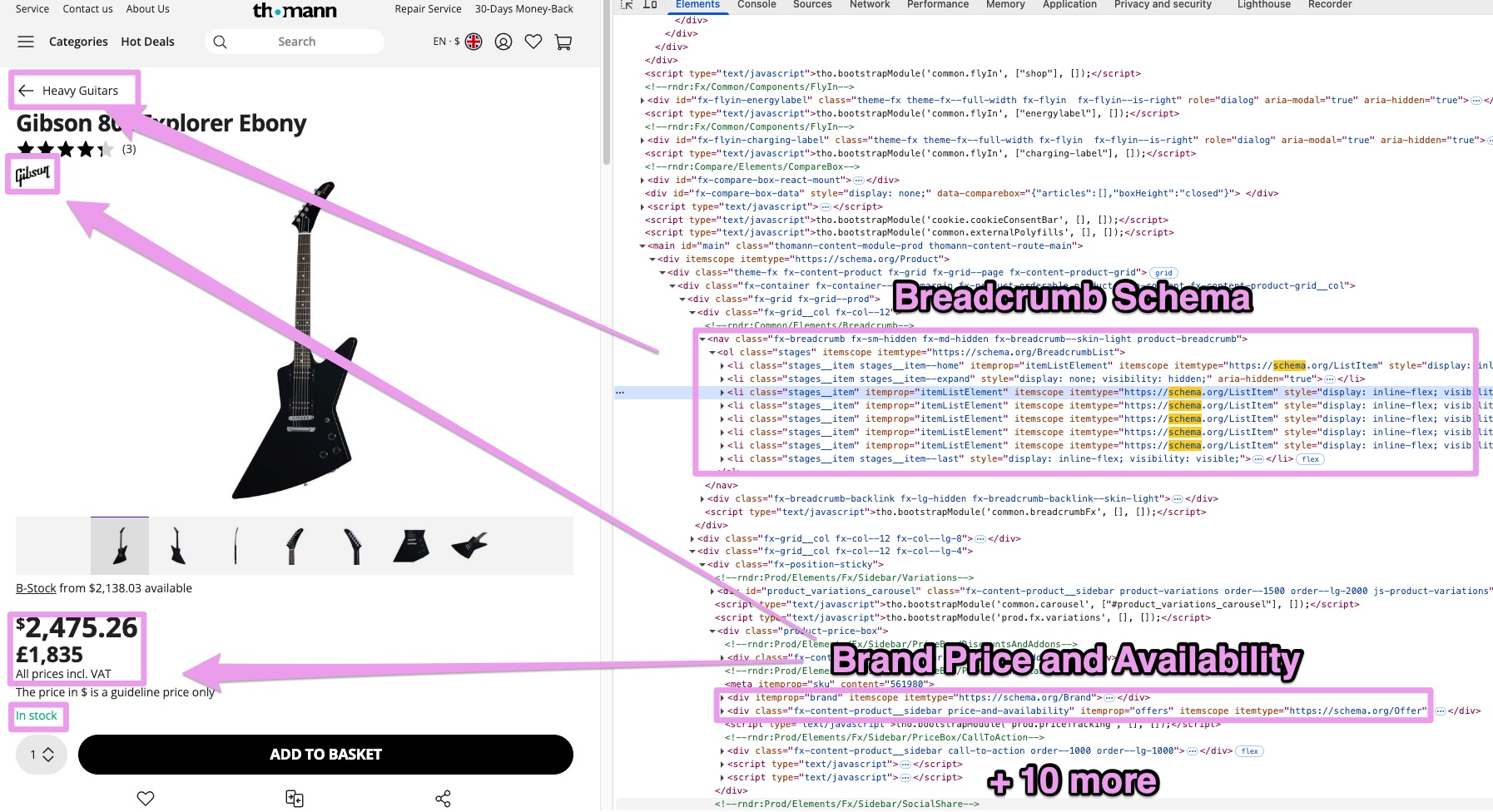 Look at how major retailers like Thomann use extensive schema markup—aim for the same thoroughness.