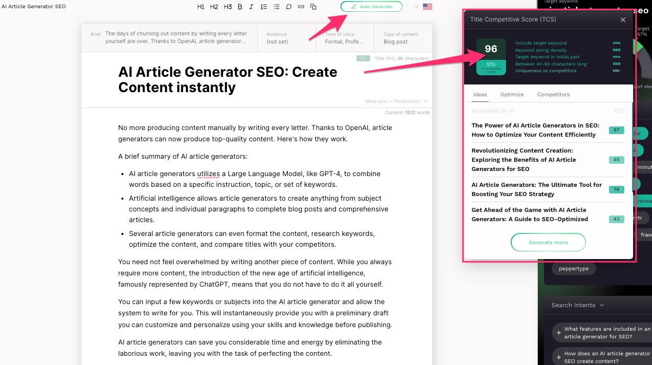 Our AI-powered Title Competitive Score (TCS) feature enables real-time analysis of title effectiveness by comparing it with top-performing titles in your industry. Customizable TCS thresholds allow you to optimize your article titles for maximum search engine visibility and reader engagement.