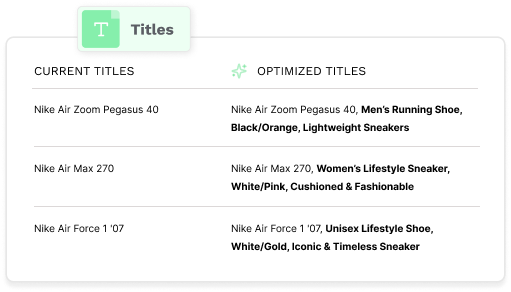 Manually tweaking titles, categories, and attributes across hundreds - or thousands - of SKUs is slow, error-prone, and simply can’t keep up with Google’s evolving algorithms.