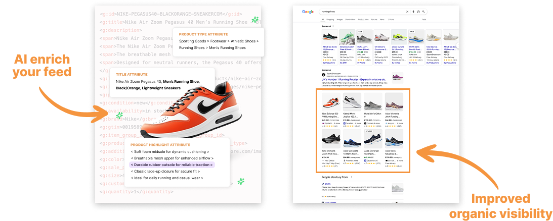 Our platform automatically enriches every item in your feed: mapping the right product types, filling gaps with search-friendly attributes, refining descriptions, and even matches titles with user click data insights.
